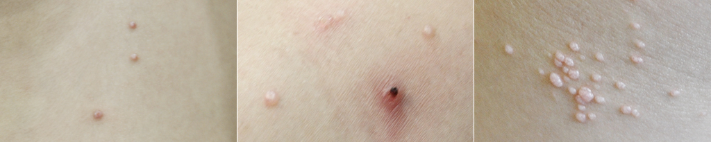 물사마귀는 3~6mm정도 크기의 돔(dome)모양으로 가운데에 배꼽처럼 옴폭하게 들어가 있는 형태의 바이러스성 피부질환입니다. 살색, 또는 분홍색의 좁쌀모양의 수포성구진이 몸의 피부와 점막 등 신체 어느 부위에서나 발생할 수 있는데 성인보다는 주로 소아에 많이 발생하며, 여아보다 남아에게서 발생 빈도가 높습니다. 특히 아토피성 피부염, 모공각화증 등 피부 질환을 동반하고 있는 경우에 환부를 중심으로 발생하는 경우가 많습니다.