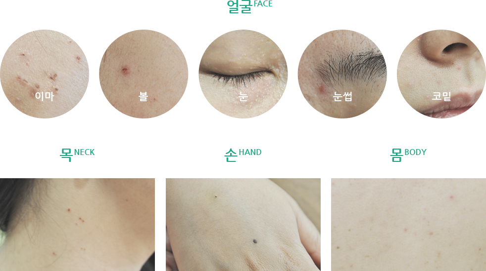 편평사마귀는 살색 혹은 옅은 갈색을 띠는 2~5mm 정도 크기의 약간 융기된 편평한 다각형 형태의 바이러스성 피부질환입니다. 많은 수의 자잘한 구진이 얼굴과 목 부위에 발생하여 피부 미용에 심각한 악영향을 미치는 편평사마귀는 주로 얼굴, 목, 가슴과 팔, 다리에 주로 발생하지만 등이나 배를 비롯한 인체 모든 부위에서 발생할 수 있습니다.