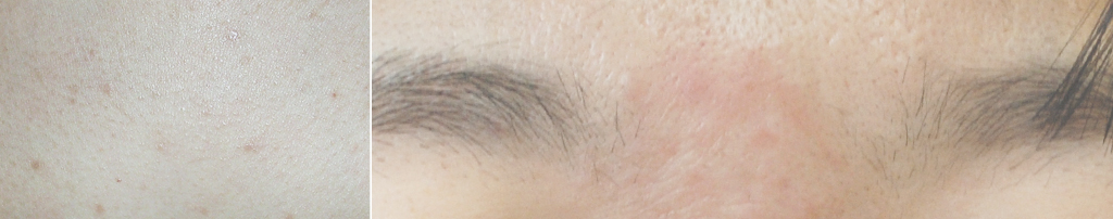 광대뼈 주위, 코, 뺨에 구진성 발진이 나타나며 지속적으로 붉은색의 홍반이 발생하여 얼굴이 붉어지고, 가렵고, 각질이 심하게 발생합니다.
