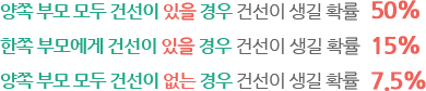 부모 건선에 따른 자녀 유병률건선은 유전적 요인과 관련성은 있으나 100% 유전되는 것은 아닙니다. 다만 식생활, 주거 등 생활 속에서 공유하는 부분이 많기 때문에 비슷한 패턴의 질병을 가질 확률이 높아질 수 있다고 볼 수 있습니다.