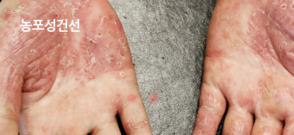 건선 부위에 붉은색 혹은 노란색의 농포가 발생합니다.