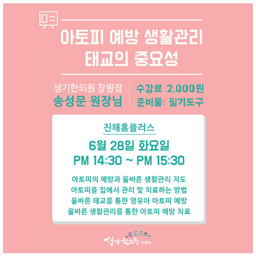 끝이 보이지 않던 아토피로 힘들었던 한 아이의 아빠에서 이제는 건강한 한 아이의 아빠로서 난치성 피부질환으로 고생하는 분들에게 희망을 나누어 드리려고 합니다. 한 분 한 분을 가족과 같이 여기며 평생 주치의로서 책임을 다하겠습니다. 천천히 치료하더라도 제대로 치료하겠습니다. 피부에 생기를...마음에 생기를...창원생기한의원 송성문입니다.