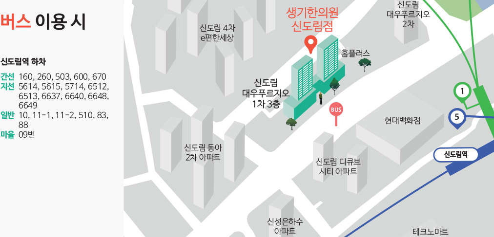 생기한의원 신도림점은 지하철 1,2호선 신도림역 1번, 5번 출구